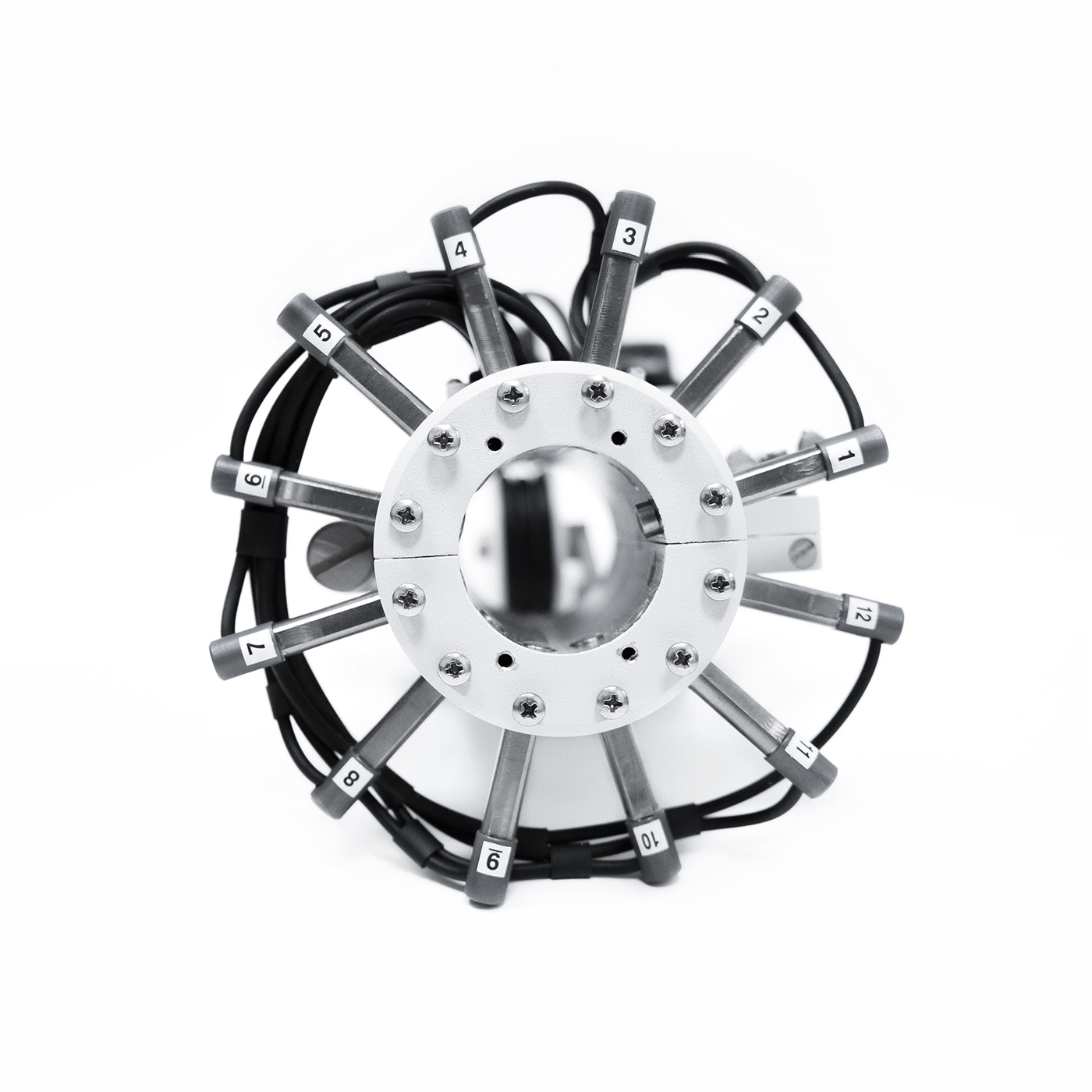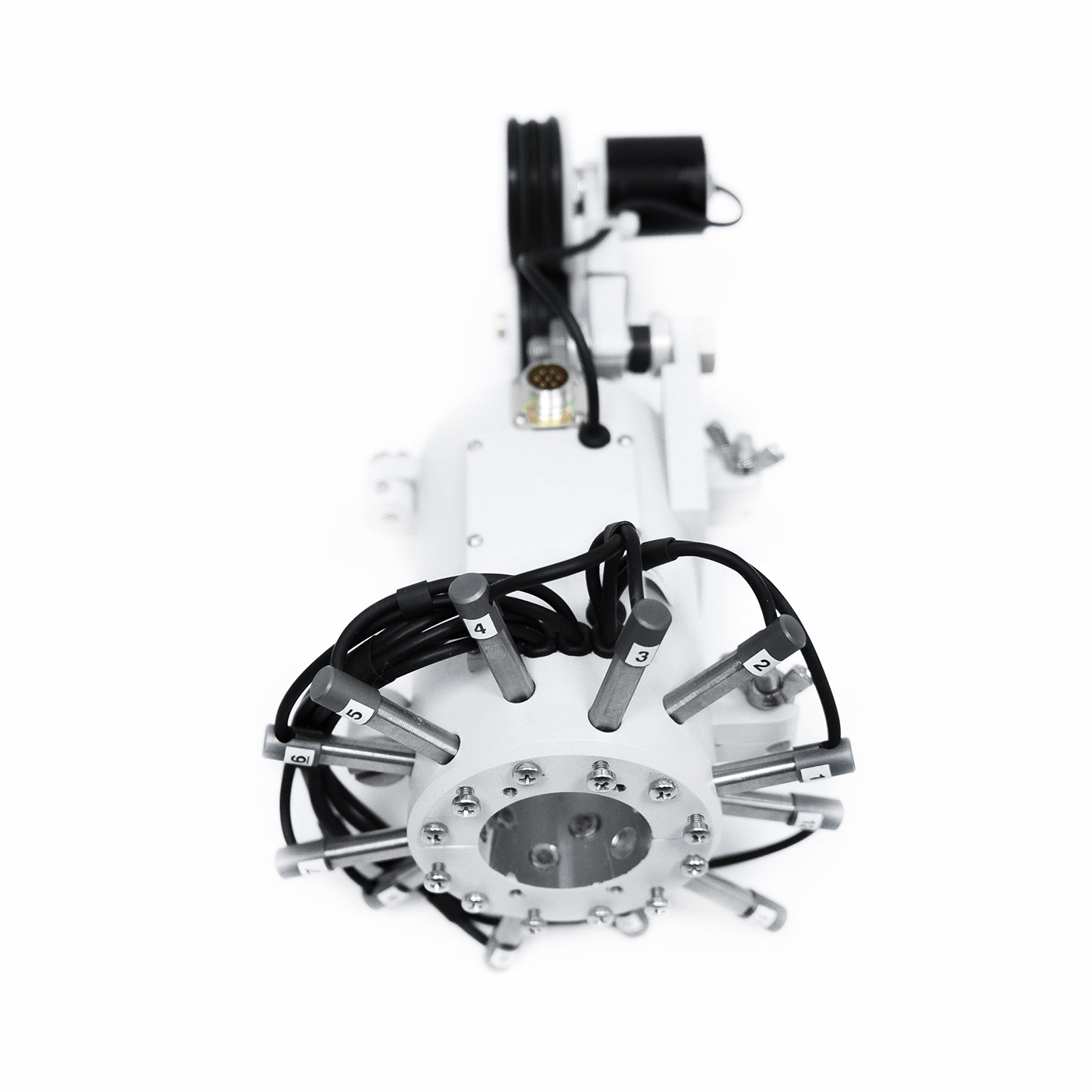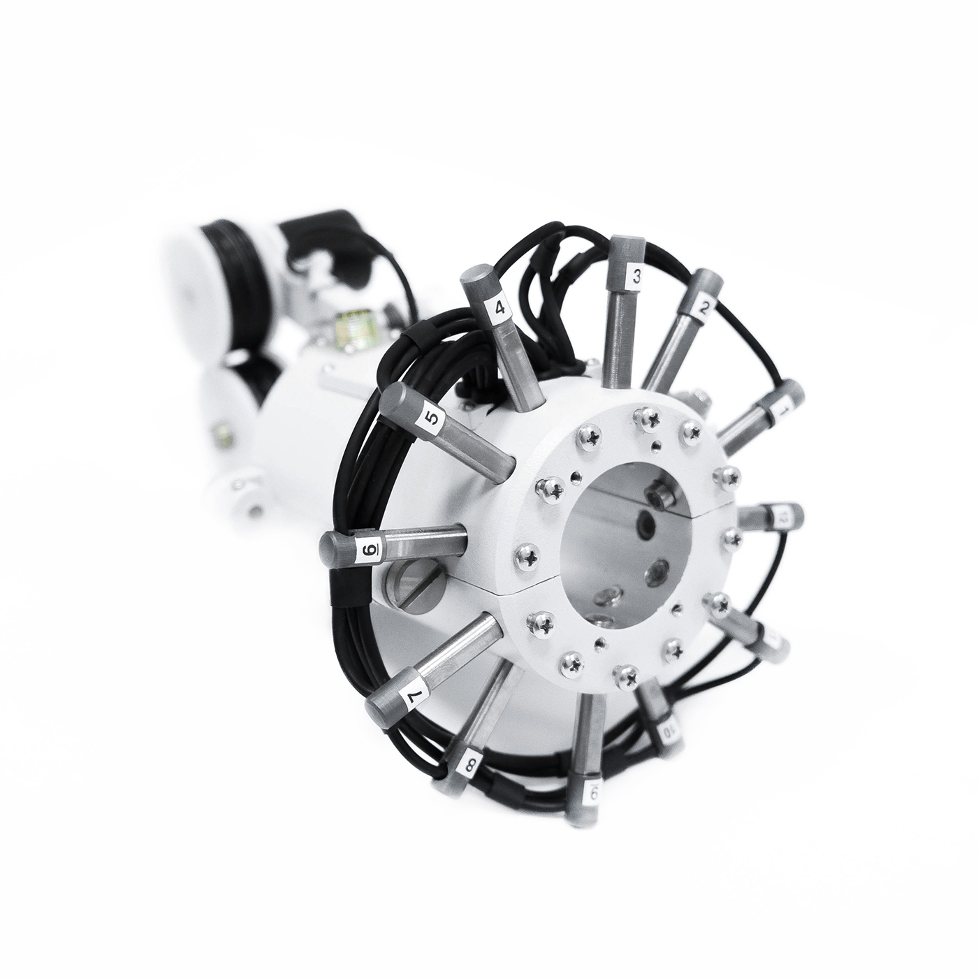 Многоканальное сканирующее устройство со встроенными однокомпонентными датчиками предназначено для контроля стальных канатов, валов и длинномерных труб малого диаметра.
